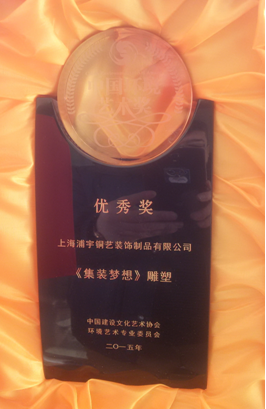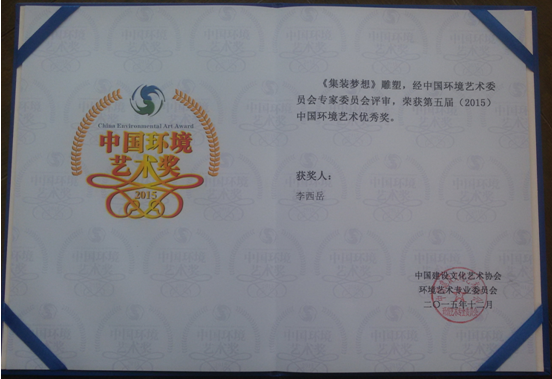 2016月1月23日在北京隆重召開(kāi)的“2015中國(guó)環(huán)境藝術(shù)年會(huì)暨第五屆(2015)中國(guó)環(huán)境藝術(shù)獎(jiǎng)?lì)C獎(jiǎng)典禮”上,我公司為上海青浦出口加工區(qū)設(shè)計(jì)、制作的大型城市雕塑“集裝夢(mèng)想”,獲得第五屆“中國(guó)環(huán)境藝術(shù)獎(jiǎng)”。