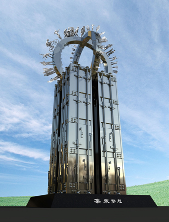 名稱:《集裝夢(mèng)想》? 總高度:12.66米?? 面積:360平方米?? 材質(zhì):不銹鋼??? 工藝:鍛、鑄結(jié)合,表面為鏡面處理?? 作者:李西岳??? 安裝地:上海市青浦區(qū)出口加工園區(qū)滬青平公路崧華路口